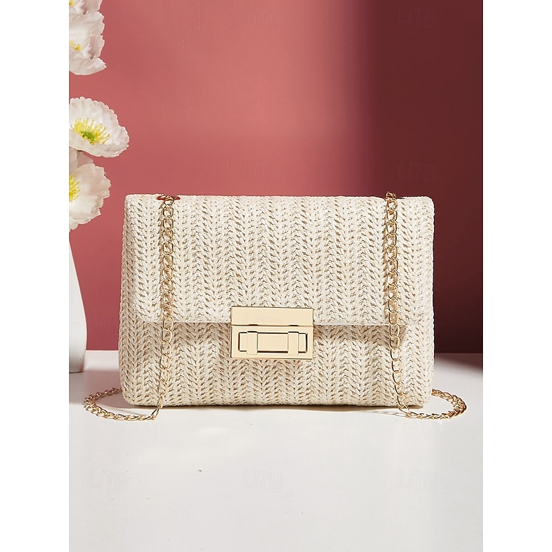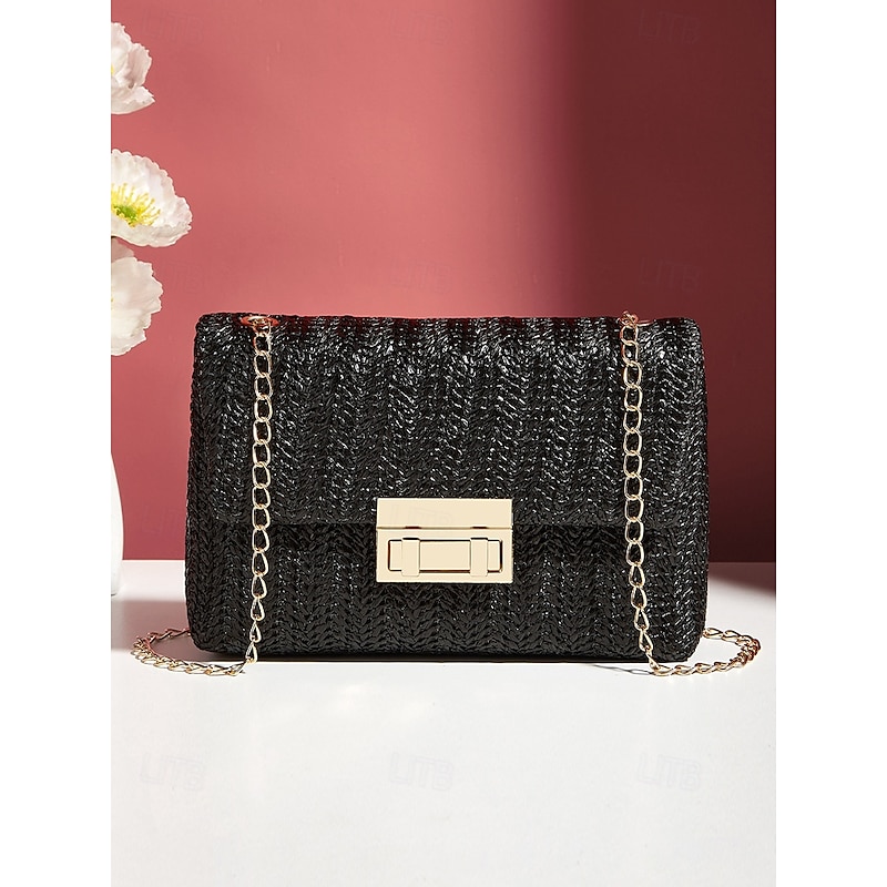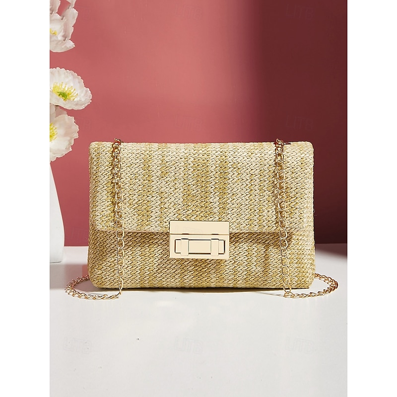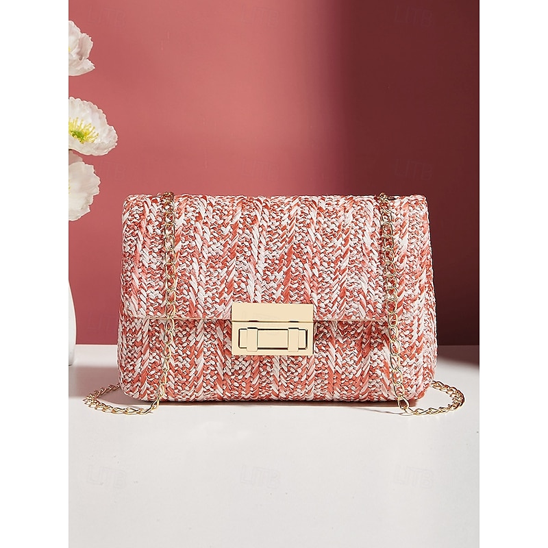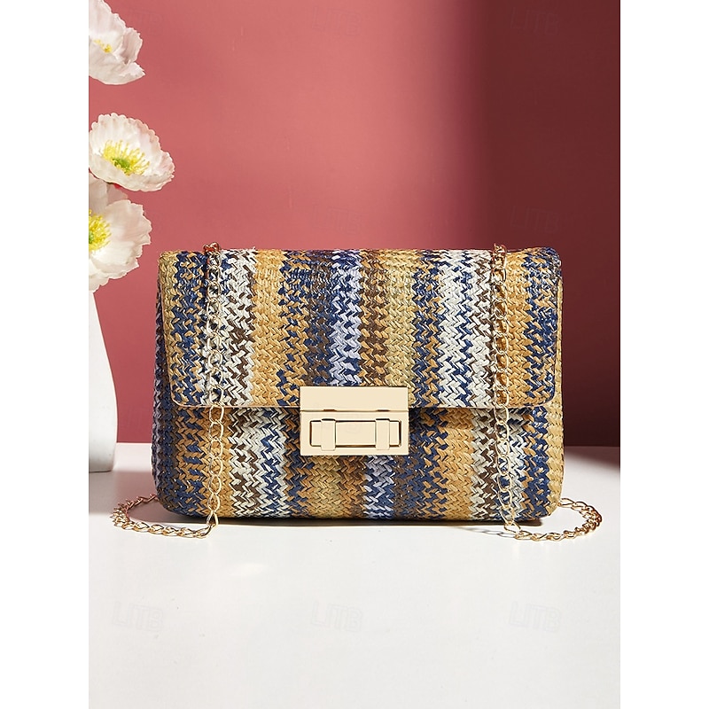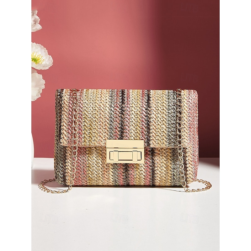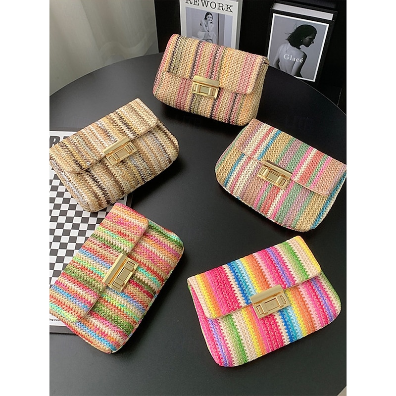 trending ! Women's Rainbow Woven Shoulder Bag – Colorful Crochet Crossbody Purse with Gold Chain Strap for Summer, Beach and Vacation Outfits