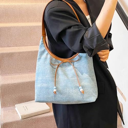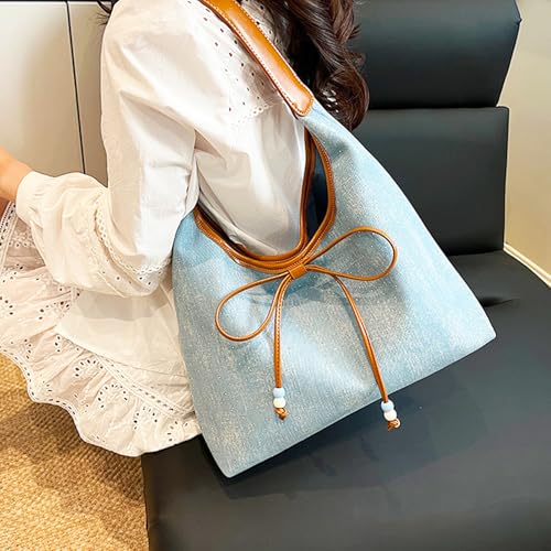 Denim Tote Bag, Bow Rhinestone Shoulder Bag, Large capacity handbag for Women Wedding, Prom, Parties(Brown)