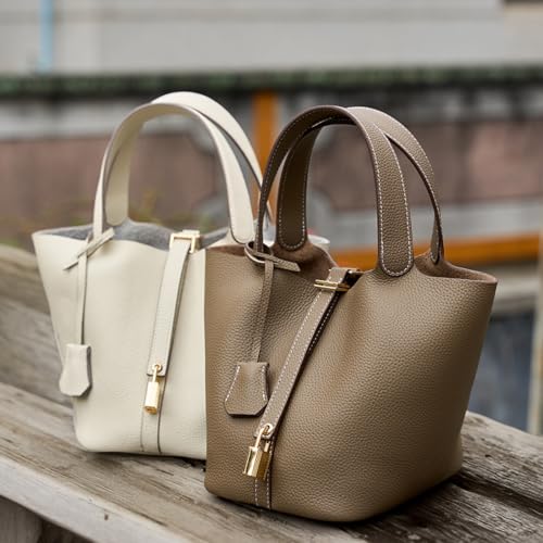Genuine Leather Lock Design Bucket Bag Vegetable Basket Shoulder Handbag