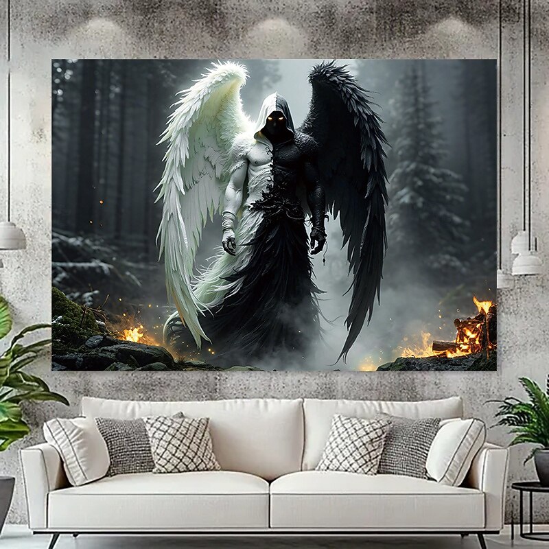 trending ! Dark and Light Angel Tapestry – Gothic Fantasy Wall Hanging with Black and White Wings, Forest and Fire Scene, Spiritual Wall Decor for Bedroom or Living Room