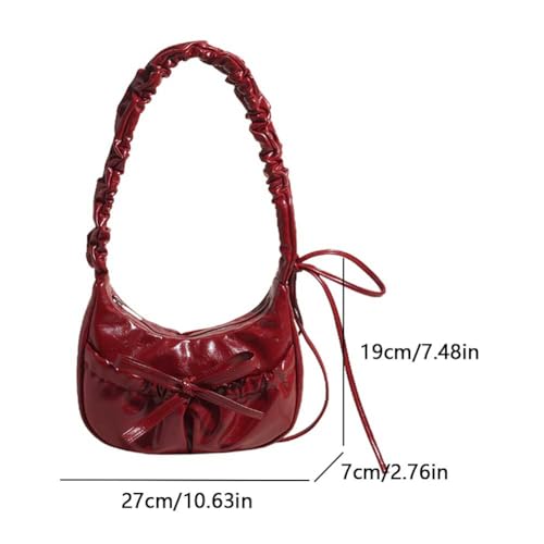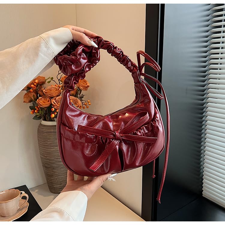 Women Bow Leather Pleated Crescent Shoulder Bag Adjustable Single Strap Crossbody Bag Solid Color Luxury Elegant Ruched Bag Z