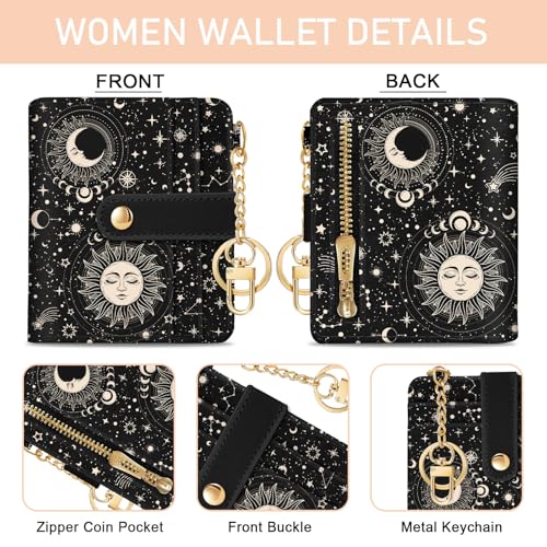 trending ! Sun and Moon Rfid Women Wallet, Small Slim Thin Credit Card Wallet, PU Leather Bifold Cash Zipper Coin Pocket ID Window for Female Ladies Teen Girls Girly