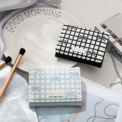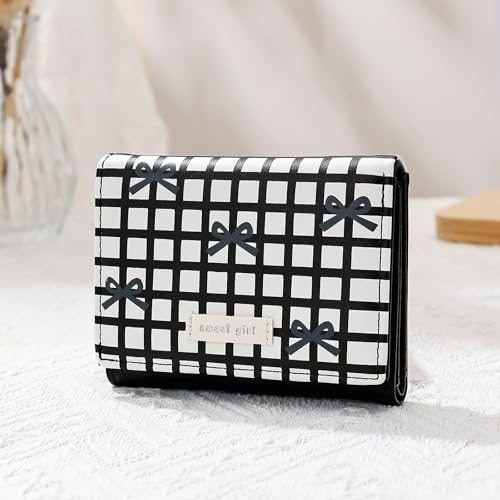 trending ! Small Wallets Woman, Cute Tri-fold Coquette Wallet for Women, Checkered Bow Credit Card Coin Holder Purse with ID Window for Key Cash Change (Black)