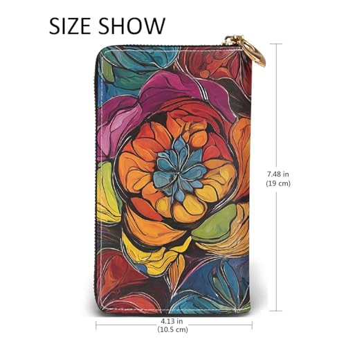 (flower stained glass) Faux Leather Wallet Long Clutch Zipper Purse Card Holder Travel Coins Cash Organizer Phone Pocket 7.48 x 4.13 x 0.9 inches
