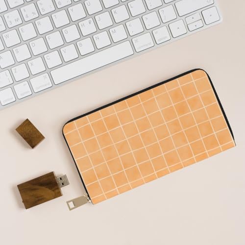Orange Hand Drawn Grid Print Wallet Women Men, Long PU Leather Wallets for Women, Cute Womens Travel Wallet Purse Pouch with Zipper Pocket