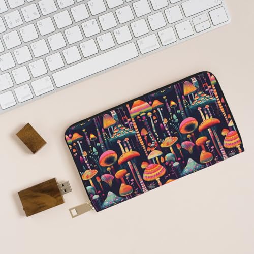 Leather Thin Slim Wallets for Women & Men - Colorful Mushroom 1 Print Card Wallet Holder with Zipper