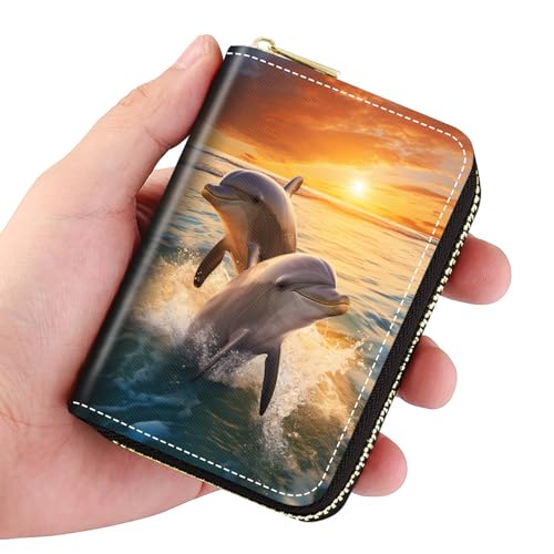 Credit Card Holder Wallets for Women, Slim Leather Card Holder Wallet, Credit Card Wallet Organizer, Pocket Business Card Case with Zipper, Dolphins At Sunset