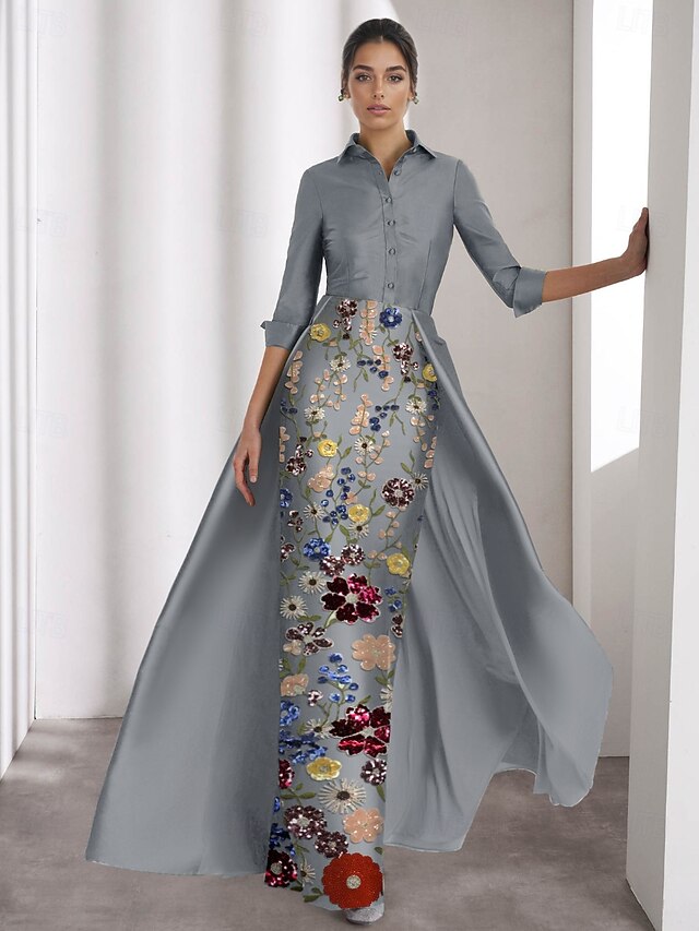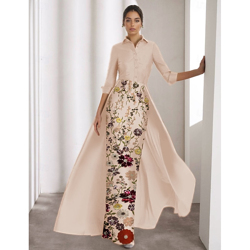 trending ! Embroidered Column Evening Gown Elegant Formal Wedding Guest Floor Length Long Sleeve Shirt Collar Satin with Glitter