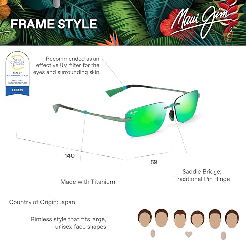 Care instructions: Clean lenses with a microfiber cloth, avoid contact with water, store in a protective case when not in use.Origin: ImportedClick the Maui Jim link above to visit our brand store, where you can find our entire catalog of sunglassesAll Maui Jim sunglasses feature PolarizedPlus2 lens technology that go beyond shielding your eyes from glare and harmful UV rays by enhancing colors to reveal the true beauty of the world around youEnjoy ultimate UV protection combined with premuim style, incredible durability, glare-free vision, and color-boosting patented technologiesMAUIGreen - Our green mirror coating provides a fashionable new look that offers the same amazing color enhancement and clarity as all other Maui Jim lenses.Titanium frame is lightweight, durable and comfortable Perfect for everyday use. finest materials and excellent craftsmanship ensure long-lasting durability.