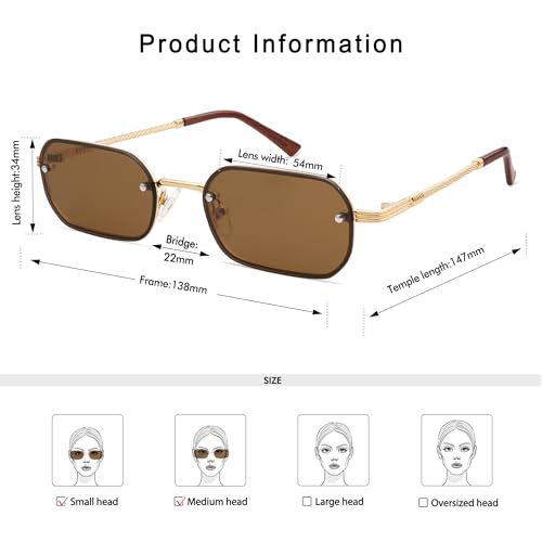 Origin: Imported90s METAL SUNGLASSES -The rectangle sunglasses for women are one-of-a-kind small square metal frame with 99.9% UV protected lenses. Retro rimless sunglasses and the threaded temples design details create the aesthetics frame.MENS RECTANGLE SUNGLASSES -The rectangle sunglasses for men make rectangle sunglasses look chic. Whether in black, gold, green, or brown, rimless sunglasses are the perfect accessory to complement any outfit. Men shades sunglasses can go with various of features.HIGH-QUALITY MATERIALS - Made of lightweight metal sunglasses, reinforced metal hinges and integrated nose pads, which makes men rectangle sunglasses perfect. Small rectangle sunglasses look mysterious and personality,which is a must-have for hipsters daily wardrobe.PRODUCT DIMENSION - Lens Width: 54mm; Lens Height: 34mm; Temple Length: 147mm; Nose Bridge: 22mm.Manual measurements will have a deviation of 1-3 mm.GIFT PACKAGE SERVICE - Sunglasses*1, microfiber pouch*1, microfiber glasses cleaning cloth*1, glasses box*1. These are gift packaged ready, which would be great gift idea for your friends and family! Perfect for everyday use. excellent materials and excellent craftsmanship ensure long-lasting durability.