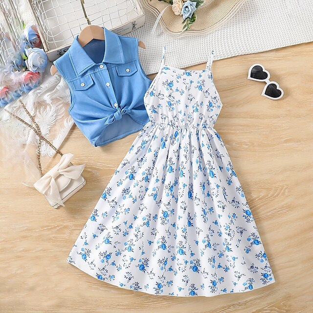 trending ! 2 Pieces Kids Girls' Solid Color Tie Knot Dress Suits Set Sleeveless Fashion School 7-13 Years Summer Light Blue