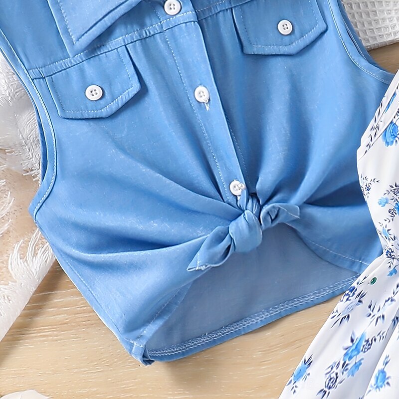 More information about 2 Pieces Kids Girls' Solid Color Tie Knot Dress Suits Set Sleeveless Fashion School 7-13 Years Summer Light Blue