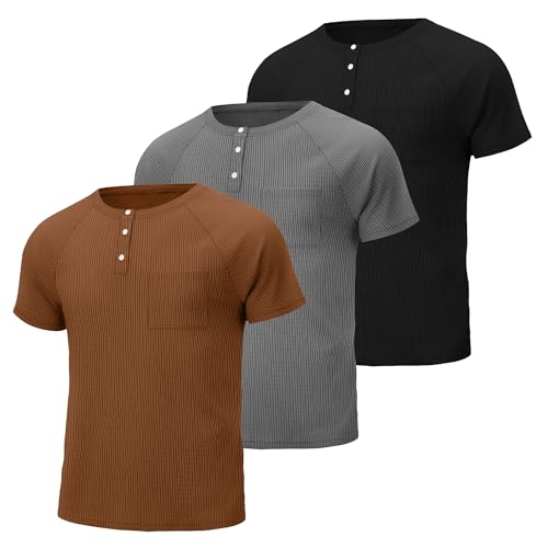 3 Pack Men's Big and Tall Waffle Henley T-Shirts, Raglan Short Sleeve Button Oversized Tops Basic Tees with Pocket