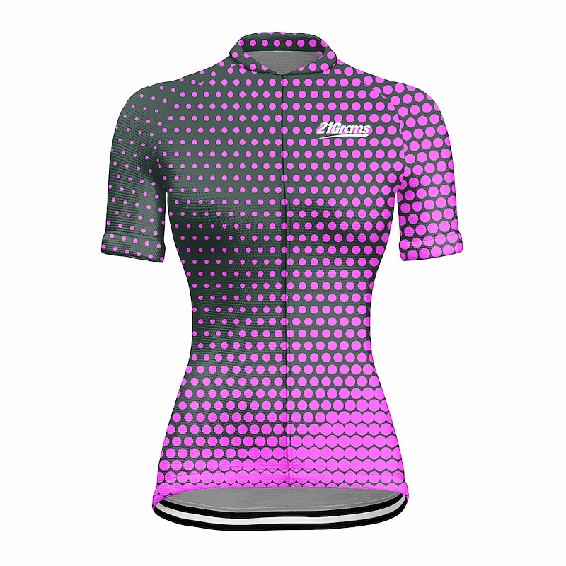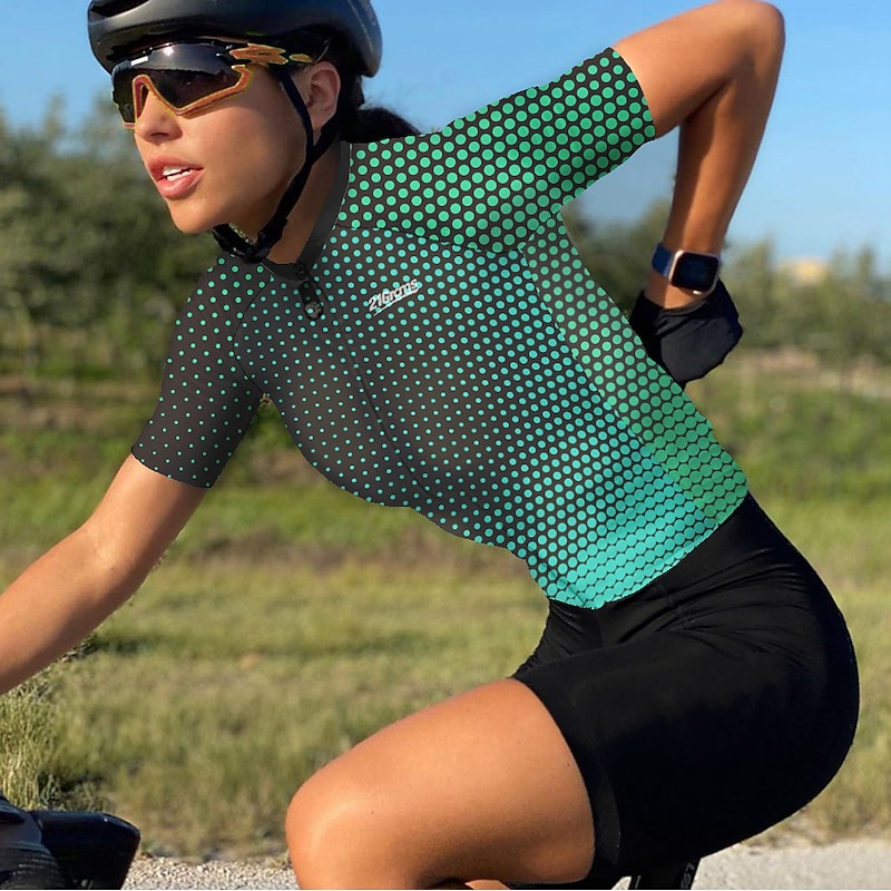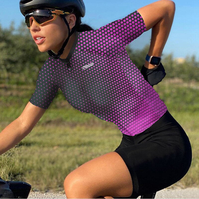 Highlights - enduring 3-pocket design of our cycling shirts for men allows easy storage of essentials like your wallet, maps, and snacks. - The quick-dry fabric of our cycling jersey short sleeves offers superior moisture management to keep you cushy and dry during your ride. - Say goodbye to slipping shirts with our anti-slip silicone hem, which holds the biking clothing in place while pedaling. Plus, the high elastic tricot fabric of the cuff adds anti-skid function. - Stay safe in low-light conditions with the reflective strip, making you visible and preventing traffic accidents while cycling. - Designed for women who live an active lifestyle, our polka dot patterned shirt is stretchy and flexible, making it ideal for mountain bike MTB and road bike cycling. - Enjoy the convenience and style of athleisure with all these features while still staying comfortable and functional.