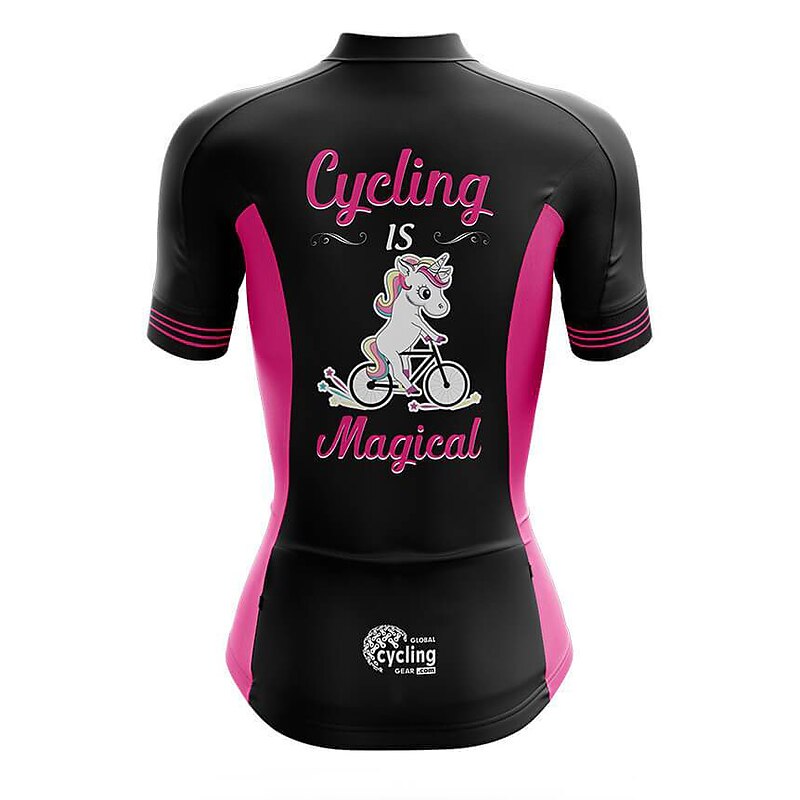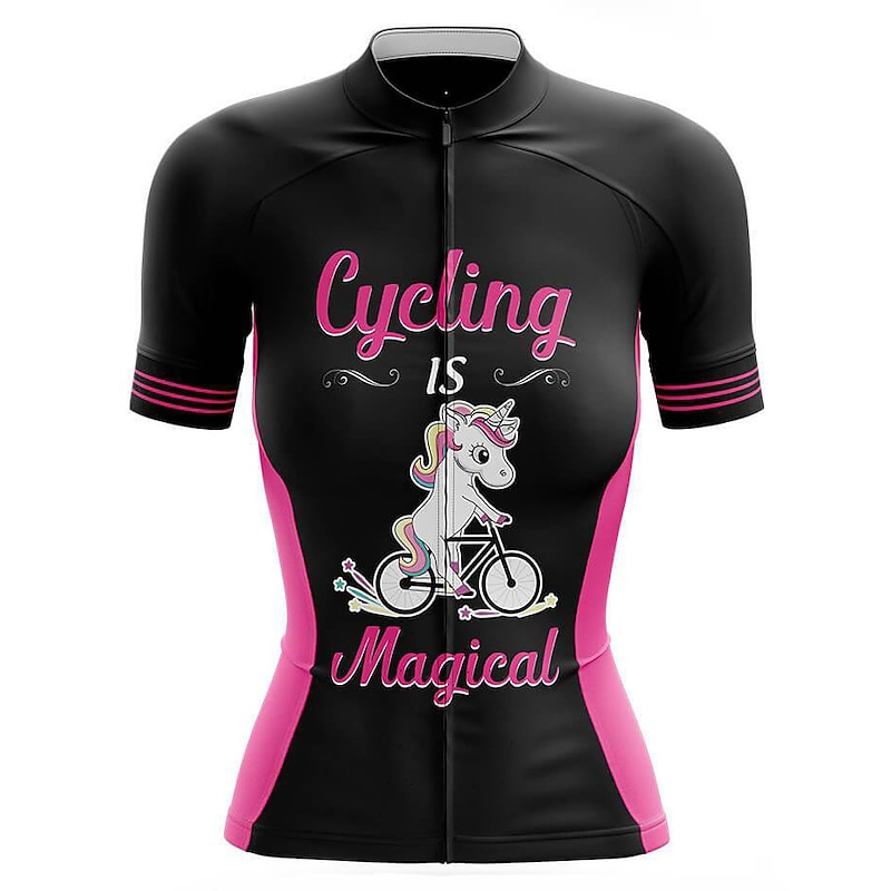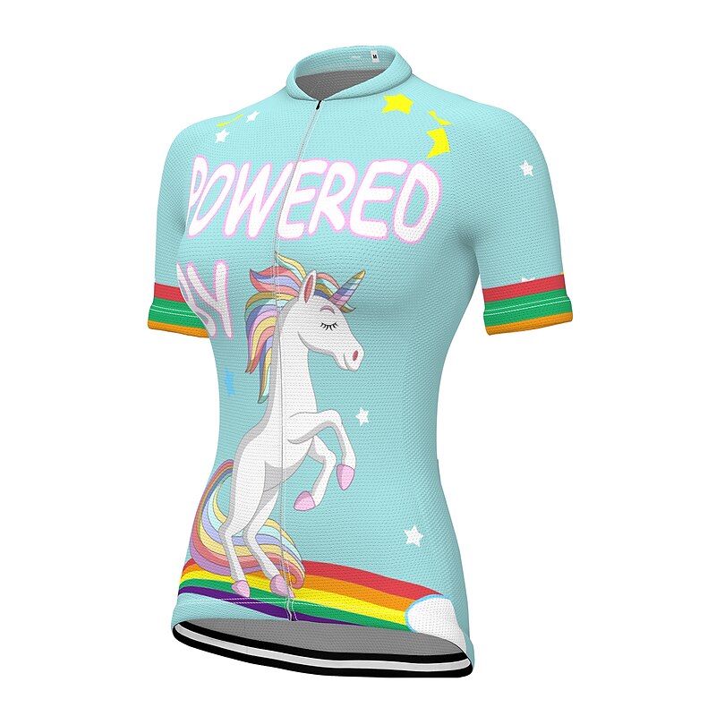 Highlights - timeless 3-pocket design offers convenience for storing essentials. - Quick-dry fabric promotes breathability and moisture management for a pleasant ride. - Anti-slip silicone hem prevents sliding and keeps the jersey in place. - High elastic tricot fabric provides additional grip and stability. - Reflective strip enhances visibility and ensures safety during night rides. - Women's stretchy athleisure wear designed for MTB and road cycling. - Quick drying and moisture-wicking properties help maintain comfort during physical activity. - Eye-catching graphic featuring a rainbow unicorn adds a touch of fun to your cycling gear.