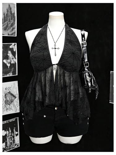 Verdusa Women's Plus Size Goth Spiderweb Mesh Sheer Halter Top Rave Club Slit Backless Peplum Tops