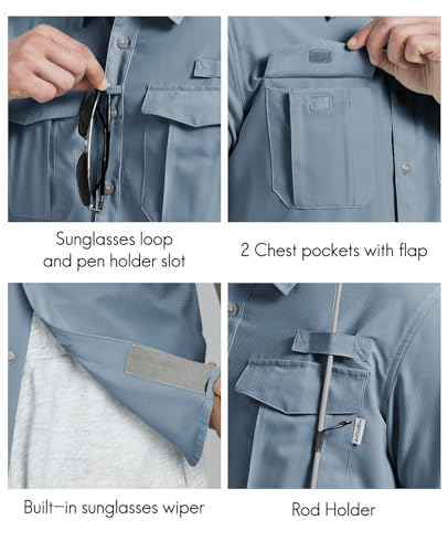 • Technical Shirts: Dual chest pockets stash maps, travel documents, or tools. This outdoor shirts also has a sunglasses loop and a pen holder slot for accessible storage. Fishing rod holder at the chest frees up your hands