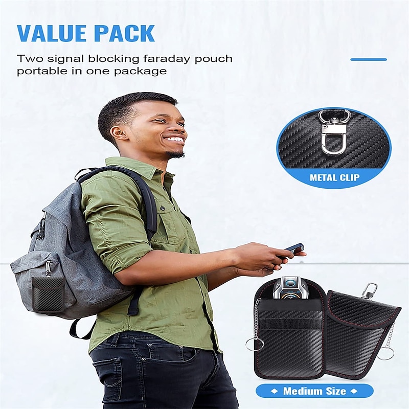 Highlights - Protects your car effectively with Lanpard faraday bags. - Blocks EMF, RFID, and other hacking signals, ensuring the safety of your belongings. - Stops thieves from remotely accessing your keyless entry fobs. - Made of premium carbon fiber material and double military-grade RF shielding cloth, providing superior protection. - Waterproof design blocks WiFi, Bluetooth, GPS, RFID, and car key signals. - Simply place your key into the closed faraday bag to prevent thieves from accessing it. - Upgraded design with a zinc alloy hook and key chain for increased strength and portability. - High-quality velcro ensures convenience and safety. - All materials have undergone rigorous testing to guarantee long-lasting performance. - Package includes two medium-sized faraday bags, accommodating multiple keychains and small devices. - effortless to carry with a size of 3.5 x 5.5 inches/9 x 14 cm. - Suitable for protecting spare key fobs or multiple vehicles in your household.