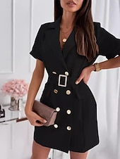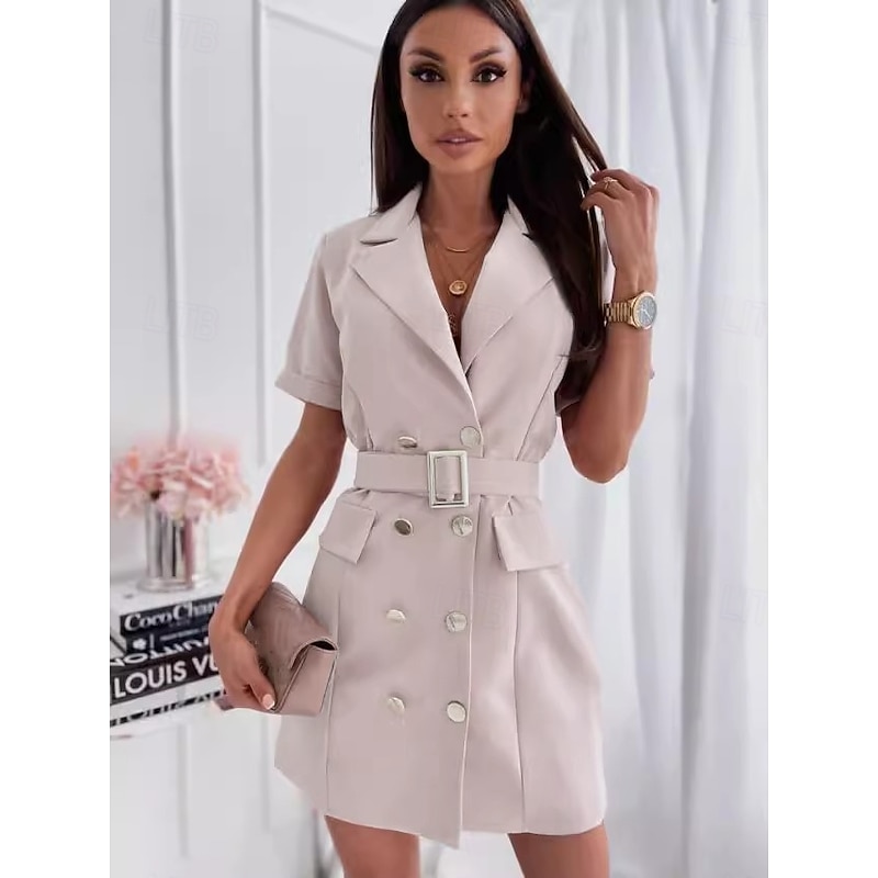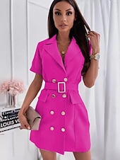 Highlights [Fabric] : Crafted from high-quality, inelastic polyester, this elegant mini dress is designed for comfort and durability. The lightweight fabric is perfect for summer wear, ensuring you feel cool and confident throughout the day. [Fit] : This dress features a regular fit that lends itself to a classic silhouette, while the included belt lets you adjust the waist to your preference, accentuating an hourglass shape. [Design Highlights] : The dress boasts a fashionable double-breasted front adorned with shiny gold buttons, providing a touch of sophistication. A notched lapel collar enhances its classic charm, and the side flap pockets add both functionality and style. Available in a range of solid colors including Blue, White, Black, Pink, Apricot, and Fuchsia, it offers chic versatility for your wardrobe. [Occasions] : Ideal for vacations, holidays, or professional settings, this dress seamlessly combines contemporary fashion with timeless elegance, making it perfect for a variety of occasions from chic gatherings to everyday sophistication. [Size Range] : Available in sizes S, M, L, XL, and XXL, providing a range to suit different body types and preferences. Perfect for everyday use. finest materials and excellent craftsmanship ensure long-lasting durability.