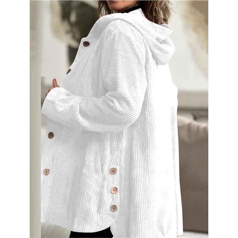Highlights ```html [Fabric]: This elegant women's coat is crafted from high-quality corduroy, providing a warm and textured feel that is perfect for the fall and winter seasons. The fabric is both thermal and breathable, ensuring comfort in colder weather. [Fit]: The coat offers a regular fit, making it an ideal choice for layering over your favorite outfits while maintaining a contemporary silhouette. Its long sleeves and dropped shoulders contribute to a relaxed and cozy appearance. [Design Highlights]: Featuring a hooded neckline for added warmth and style, this coat is designed with large, contrasting wooden buttons on the front, offering a classic and timeless appeal. The inclusion of practical side pockets adds convenience, while the plain design allows for versatile styling. [Occasion]: Perfect for daily wear, street outings, and outdoor adventures, this casual jacket is a versatile addition to your wardrobe. Whether you're heading out for a casual day or attending a more dressed-up occasion, it seamlessly blends comfort with effortless style. [Size Range]: Available in a range of sizes from Small to 2XL, this coat accommodates various body types, ensuring a comfortable and flattering fit for everyone. The rich color options, including Black, White, Sky Blue, and Wine, add an elegant touch to your ensemble. ``` Perfect for everyday use. superior materials and excellent craftsmanship ensure long-lasting durability.