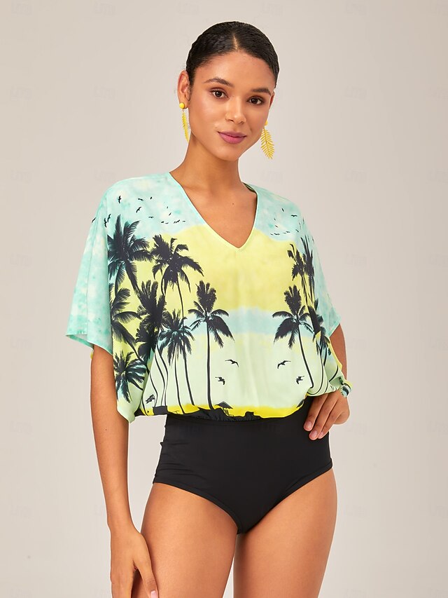 trending ! Gradient Palm Tree Print Casual Beach Bodysuit Vacation Style