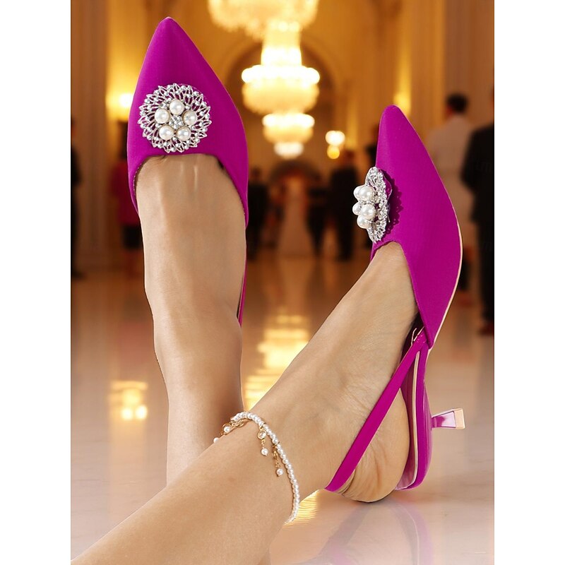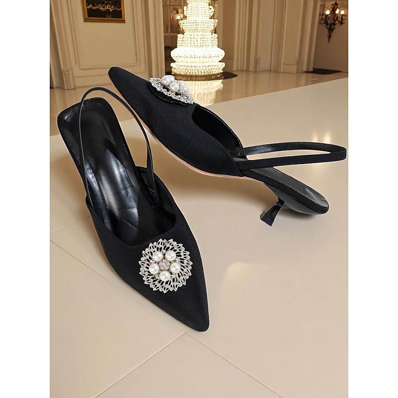 Why Choose Women's Blue Satin Slingback Pumps with Pearl and Rhinestone Embellishment, Pointed Toe Kitten Heels for Upscale Parties and Cocktail Events?