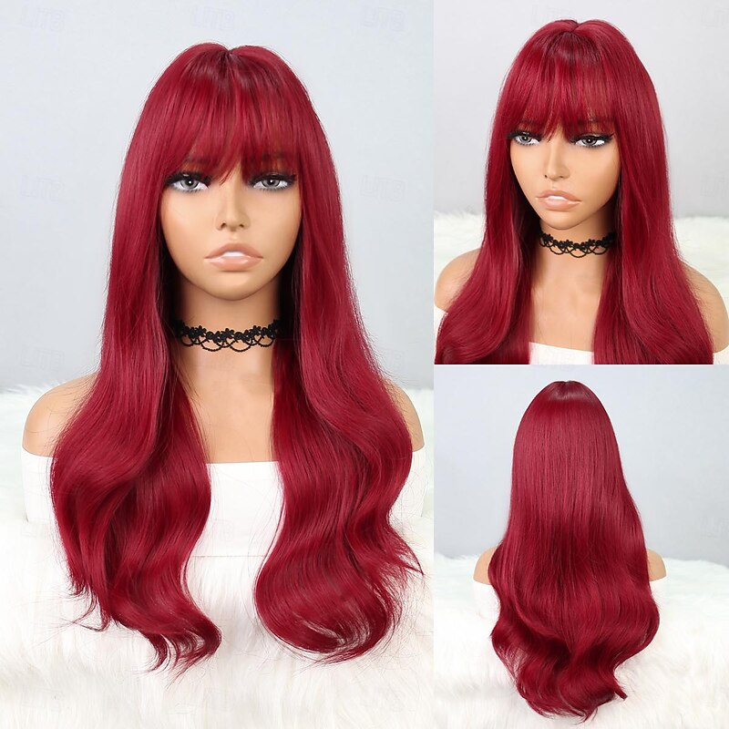 Why Choose Synthetic Wig Natural Wave Deep Wave Neat Bang Wig 24 inch Dark Brown Wine Red Synthetic Hair Women's Red Brown Burgundy?