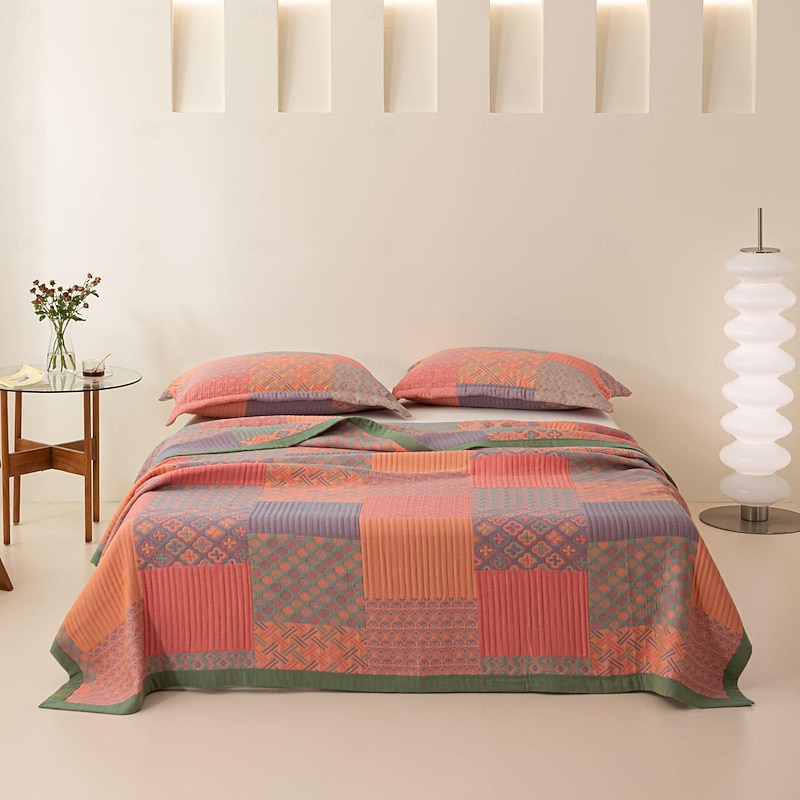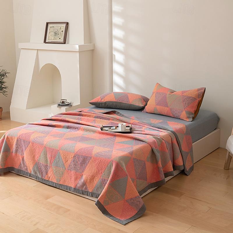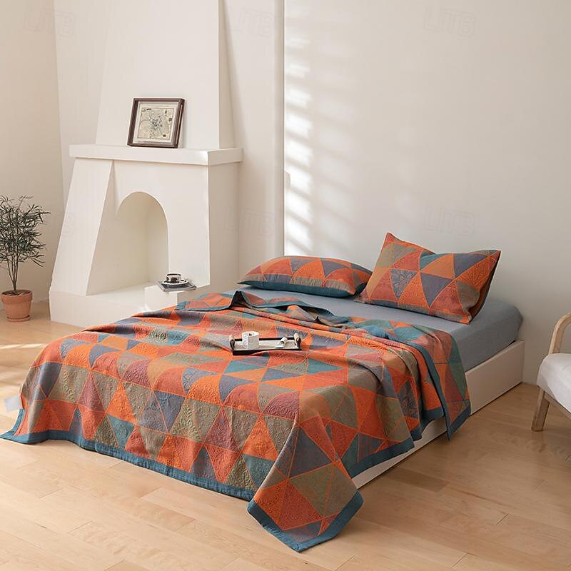 Highlights [Fabric] Crafted from 100% high-quality cotton, this air-conditioning blanket features a 3-layer gauze construction ensuring optimal breathability and a smooth touch. The natural cotton fabric offers a gentle and cozy experience, suitable for all skin types, making it an excellent choice for year-round use. [Style] The blanket showcases a vibrant geometric pattern featuring triangles in shades of orange, teal, and green, perfect for adding a splash of color to your home. Its design provides a textured appearance that complements a variety of interior styles, from bohemian to contemporary. [Design Highlights] The intricate detailing on the fabric suggests an embossed or embroidered texture, providing a tactile depth that enhances its visual appeal. The current geometric pattern infuses personality and vibrancy into the blanket, making it a standout piece in any room. [Occasions] Ideal for use as an air-conditioning blanket during summer, a cozy throw during cooler months, or a decorative bed cover anytime. It’s a versatile addition to your bedding collection, offering function and style for various settings, like a living room or bedroom. [Size Range] Available in multiple sizes including 200x240cm, 250x240cm, 150x240cm, and 220x240cm, this blanket is designed to fit a variety of bed sizes and preferences, ensuring there’s a perfect fit for every home.