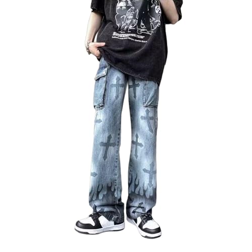 Fabric type: 65% Polyester, 35% ViscoseCare instructions: Machine WashOrigin: ImportedClosure type: ZipperMaterial: Baggy jeans men are made from a durable polyester and viscose blend, offering a smooth touch, wrinkle resistance, and cozy wear.Cross & Flame Print: Baggy jeans men feature cross motifs with flame-inspired fades, bringing gothic street style to your everyday wardrobe.Relaxed Fit: Baggy jeans men are cut with a wide-leg silhouette and low-rise fit, providing ease of movement and a relaxed urban feel.Utility Pocket Detail: Baggy jeans men are equipped with side flap pockets, enhancing the cargo aesthetic and adding practical storage.Streetwear Versatility: Baggy jeans men pair effortlessly with oversized tees, sneakers, or hoodies for an edgy and expressive street look. Perfect for everyday use. finest materials and excellent craftsmanship ensure long-lasting durability.