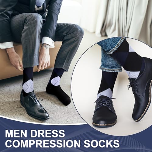 Fabric type: Cotton, nylonOrigin: ImportedMultiple Designs and Combinations: you will receive 10 pairs of Men's calf dress compression socks, available in 2 color schemes—black and navy blue—with 5 classic and fashionable designs per color; The novel colors and designs meet your daily wear, replacement, and sharing needs; These socks are highly durable, resistant to fading and damage over time, ensuring optimal compression for your feet and providing an excellent wearing experienceGraduated Compression: these 8-15mmHg light compression socks feature three graduated compression zones from the ankle to the calf, offering varying levels of support to maximize blood circulation, minimize swelling, reduce the risk of blood clots and varicose veins, and alleviate leg and foot fatigue as well as muscle soreness through progressive supportComfortable Materials: made from cotton and nylon, these 8-15mmHg Graduated Support socks are reliable, soft, elastic and breathable; They provide 360-degree stretch for greater flexibility and durability, staying in place without wrinkling or slipping; The breathable, high-performance fabric maintains optimal temperatureHoliday Gift Choice: these 8-15mmHg light compression socks are comfortable and breathable, providing proper pressure to the legs; The breathable, sweat-wicking fabric keeps your feet cool and dry, making them ideal for daily life, work, and men's casual wear; They are also suitable for office workers, doctors, nurses, teachers, athletes, fitness enthusiasts, and a thoughtful gift for family and friendsVersatile Use: these Men's calf dress compression socks promote blood circulation and relieve leg pain and swelling, suitable for various situations and activities; They are ideal for men's formal wear, office workers who stand for long periods, individuals with varicose veins or edema, post-surgery patients, athletes, travelers, and more; The snug fit ensures an ideal wearing experience, making them a wonderful Father's Day or Christmas gift Perfect for everyday use. finest materials and excellent craftsmanship ensure long-lasting durability.