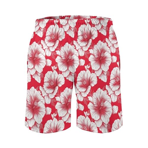 Hawaiian Shorts for Men - Comfy Tropical Red White Flowers Print Mens Swim Trunks Bathing Suits with Mesh Lining