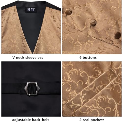 Hi-Tie Silk Mens Suit Vest Tie and Bowtie Lapel Pin Gold Tie Clip Paisley Floral Waistcoat 8PCS Set Tuxedo Wedding Party