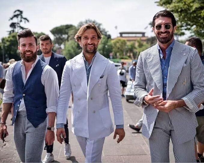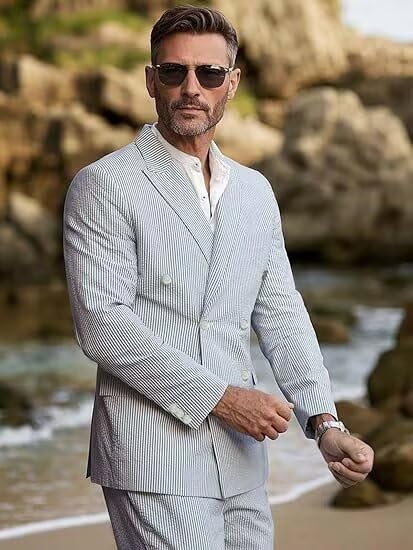 Seersucker Suit Mens 2 Piece Double Breasted Striped Seersucker Casul Summer Beach Men Suits