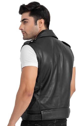 Fabric type: Premium Sheepskin LeatherCare instructions: Dry Clean OnlyOrigin: ImportedPREMIUM LEATHER MATERIAL: Genuine Sheepskin Leather with the fine stitching. exceptional premium natural leather motorcycle vest for men. Sheepskin leather vest offers maximum durability and flexibility. Natural Sheepskin leather is resistant to normal wear and tear and designed to last lifetime. motorbike gilet, leather waistcoat.This leather waistcoat with comfortable liner, which makes this vest the best companion for long bike rides and tours; Four outside Pockets and two inside design is stylish and functional, can provide proper pocket for the cell phone, wallet and key storage and also waist-belt from which you can adjust the size.This leather motorcycle lapel notch collar vest features a dual action snap button on the front and metal front zipper. The knobs are made of stainless steel. Add this Auberon Black Leather Biker Vest to your collection to have a go-to option for layering your looks. Adjustable to any weather, the piece is made from fine quality sheepskin leather and an inner satin shell for maximum comfort.The sleeveless motorcycle riding jacket is suitable for outdoor cycling sports such as motocross, mountain bikes, bicycles, snowmobiles, bicycles, and pedal electric vehicles etc. It also great choice for daily work, casual wear. leather motorcycle vest, motorcycle riding jacket. Inspired from designer-wear apparel, the jacket features a notch style collar, modern shoulder epaulets, multiple zippered and button style pockets, and a belt that secures at the waist.SIZING: We have attached a size chart at the end of images section so every buyer can choose from appropriate size and so we design the items accordingly and are made fit to perfection. Perfect for everyday use. finest materials and excellent craftsmanship ensure long-lasting durability.