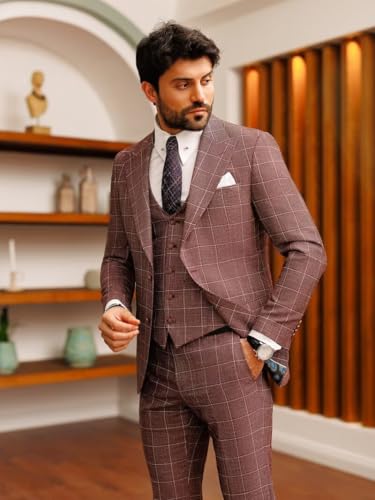 Mens 3-Piece Plaid Suit Slim Fit Formal Bussiness Wedding Suit Two Button Checked Suits Jacket Vest Pants Set